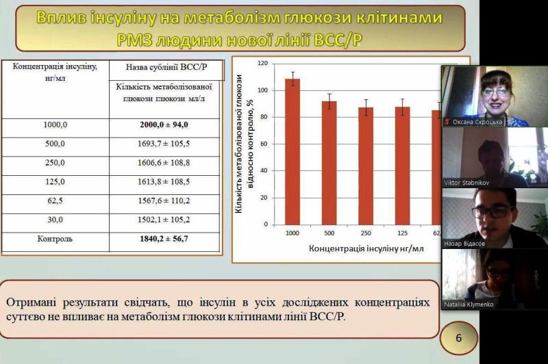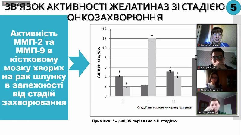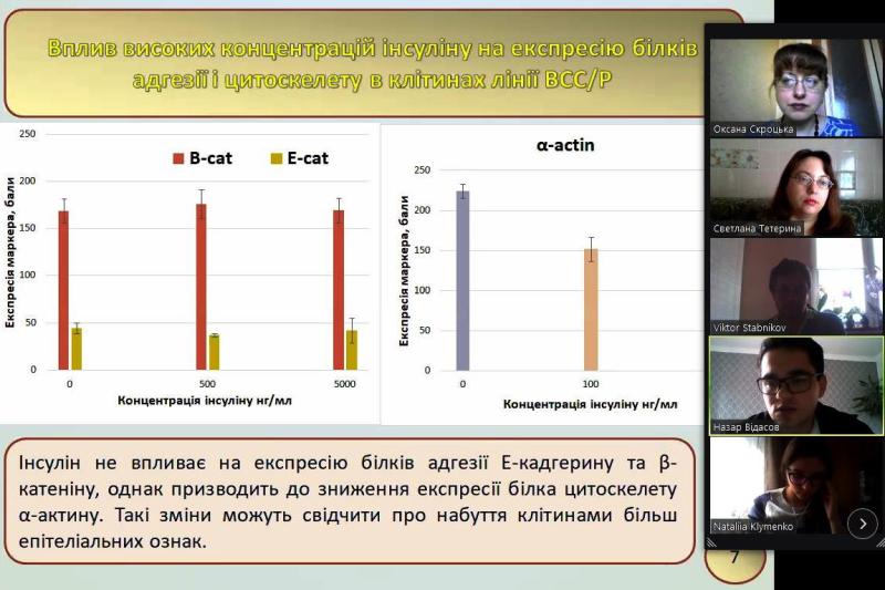 Комісією були прослухані різні доповіді. Так, Назар Видасов працює над встановленням впливу інсуліну на експресію білків цитоскелету, проліферативну та метаболічну активність пухлинних клітин, а також на міжклітинну адгезію клітин раку молочної залози з високим ступенем злоякісності, що дозволить виявити інформативні показники порушень роботи їх метаболічної системи і визначити можливість пошуку нових шляхів боротьби з даним типом пухлини. Сергій Вискірко вивчає ферменти желатинази, які беруть участь у протеолізі позаклітинного матриксу, процесах фізіологічної та патологічної реорганізації тканин організму при онкологічних захворюваннях і розглядаються як ключові молекули, що супроводжують процес метастазування та дисемінації пухлинних клітин.