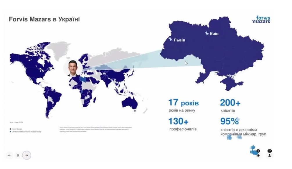 Forvis Mazars – це глобальне партнерство, що спеціалізується на аудиторських, бухгалтерських, податкових і консалтингових послугах. Компанія має понад 300 офісів і понад 40 000 працівників у більш ніж 100 країнах світу. Forvis Mazars другий рік поспіль входить до списку провідних роботодавців у Центральній та Східній Європі та має відповідний сертифікат Best Places to Work.