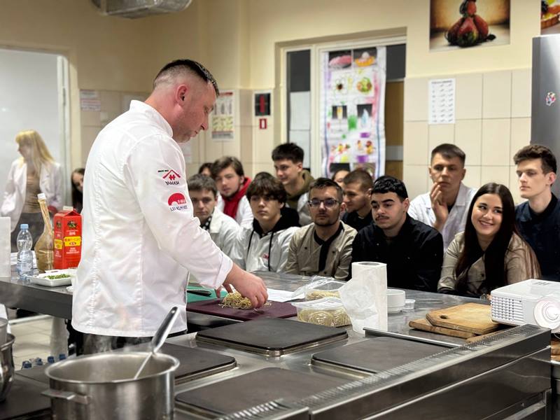 На кафедрі готельно-ресторанної справи в рамках Ярмарки вакансій-2025, за ініціювання керівниці відділу працевлаштування НУХТ Світлани Садокової відбувся практичний майстер-клас «Мистецтво рамену. Автентичні рецепти від Іллі Червенка», присвячений технології приготування рамену та інших страв японської кухні. Захід відбувся у змішаному форматі у рамках вивчення дисципліни «Кулінарна етнологія» для здобувачів спеціальності «Готельно-ресторанна справа». До участі також на запрошення кафедри готельно-ресторанної справи долучилися здобувачі спеціальності «Харчові технології» та «Туризм та рекреація», а також студенти відокремлених структурних підрозділів НУХТ – Київського фахового коледж уресторанного господарства та Волинського фахового коледжу.