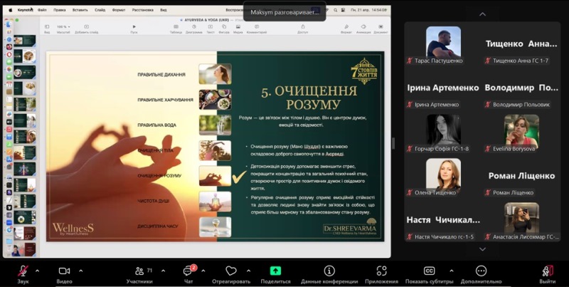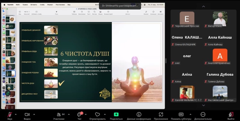Лектор докладно зупинився на кожному з них – дихальній практиці, правильному харчуванні, питному режимі, гігієні та фізичних вправах, очищенні розуму (налаштування на позитивне мислення), чистоті душі (доброзичливе ставлення до оточуючих, служіння суспільству тощо) та дисципліні часу (правильний розпорядок дня).