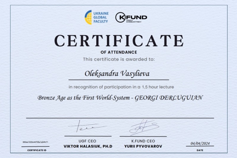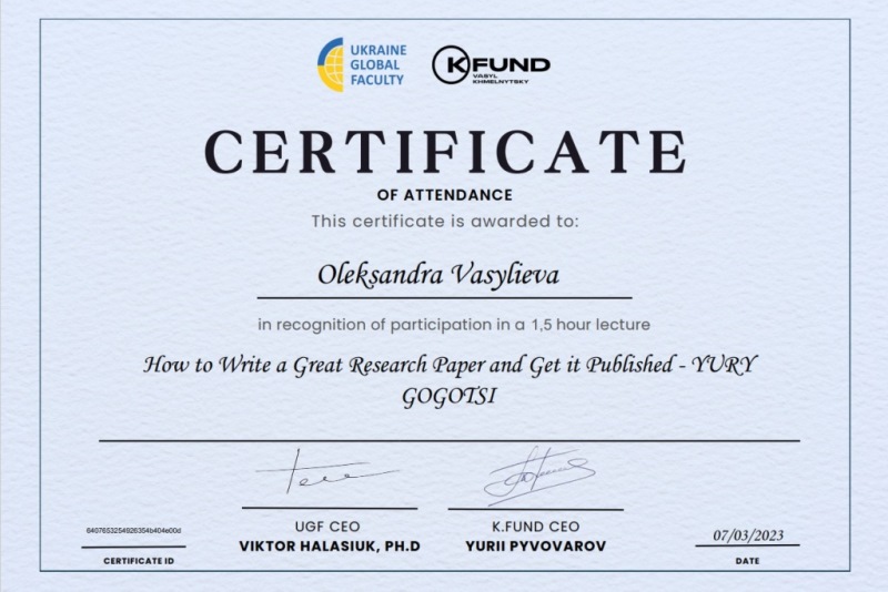 Сама Олександра долучалася вже не до однієї лекції на цій платформі, має кілька сертифікатів, наприклад з лекцій «Bronze Age as the First World-System» від Georgi Derluguian та «How to Write a Great Research Paper and Get it Published» від Yury Gogotsi і запевняє, що переваг і цікавинок на ній можна знайти дуже багато.