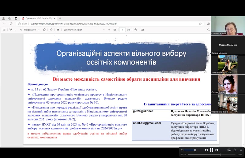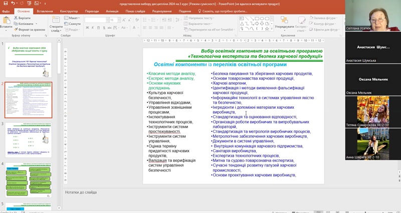15 та 16 квітня 2024 року на кафедрі експертизи харчових продуктів відбулися зустрічі робочої групи освітньо-професійної програми «Технологічна експертиза та безпека харчової продукції» першого (бакалаврського) рівня вищої освіти, доценток Світлани Усатюк, Оксани Петруші та Оксани Мельник зі здобувачами другого та третього курсів денної і заочної форм здобуття освіти щодо вільного вибору дисциплін з каталогу освітньої програми на ІІІ та ІV курсах навчання.