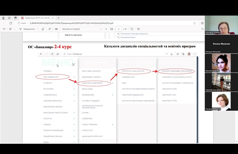 Гарантка освітньо-професійної програми Світлана Усатюк детально зупинилася на дисциплінах, запропонованих до вивчення. Показала, де на сайті університету можна знайти всю необхідну інформацію щодо каталогу дисциплін вільного вибору здобувачів освітнього ступеня «бакалавр».