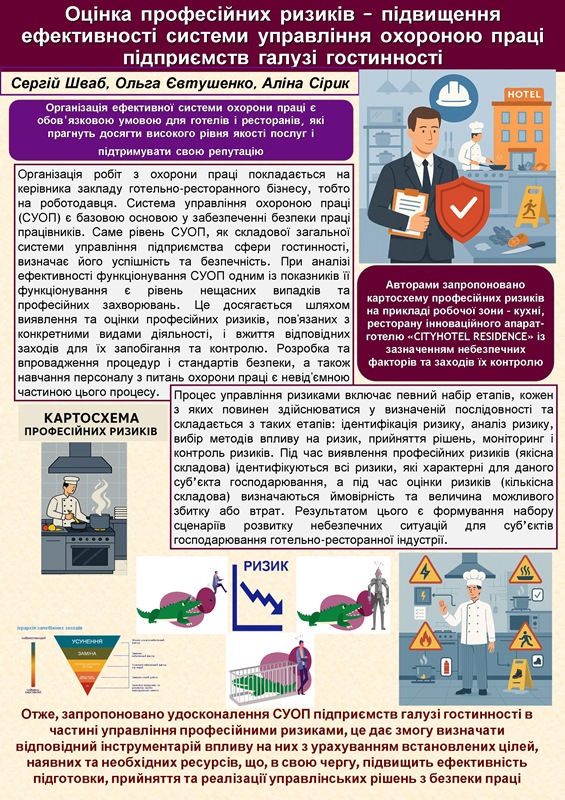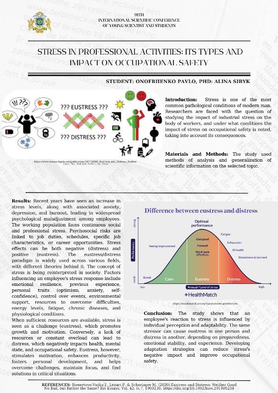 І місце – Павло Онофрієнко (група ЕК-2-5, факультет біотехнології та екологічного контролю) з темою доповіді «Stress in professional activities: its types and impact on occupational safety» і Сергій Шваб (група ОХ-3-2, Навчально-науковий інженерно-технічний інститут ім. акад. І.С. Гулого)з темою доповіді «Оцінка професійних ризиків – підвищення ефективності системи управління охороною праці закладів галузі гостинності»;