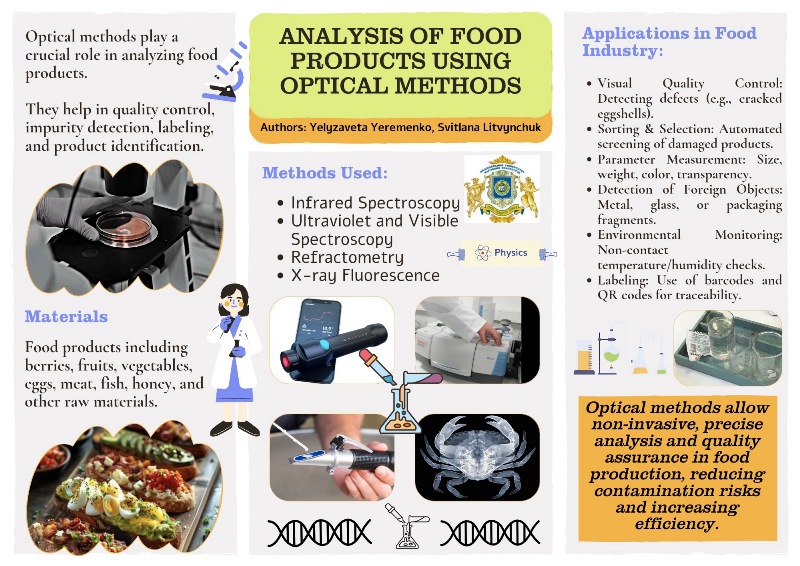ІІ місце – Єлизавета Єременко (група ТІ-1-4, Навчально-науковий інститут харчових технологій) з темою доповіді «Analysis of food products using optical methods»;