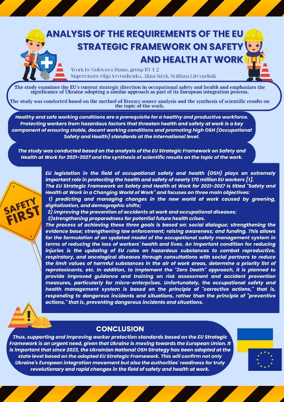 ІІІ місце – Діана Головня (група БТ-1-2, факультет біотехнології та екологічного контролю)з темою доповіді «ANALYSIS OF THE REQUIREMENTS OF THE EU STRATEGIC FRAMEWORK ON SAFETY AND HEALTH AT WORK».