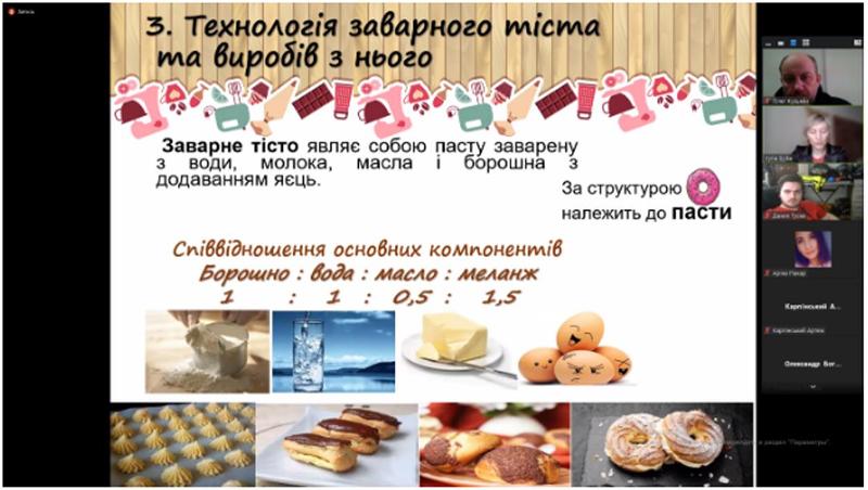 Викладачка представила основні технологічні етапи приготування напівфабрикатів із бісквітного та заварного тіста з урахуванням уже опанованих здобувачами освіти теоретичних основ попередніх навчальних дисциплін та акцентувала увагу на практичному застосуванні набутих знань.