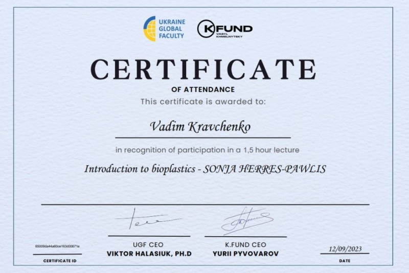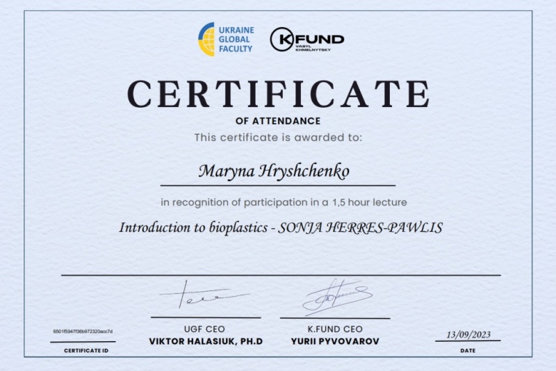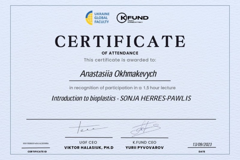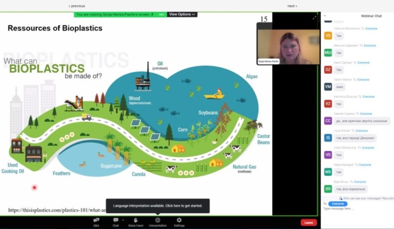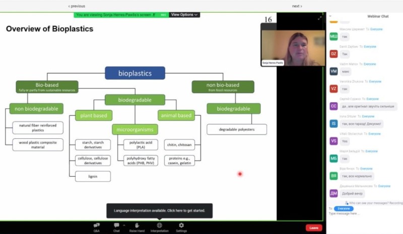 Спікеркою були розглянуті різні види біопластику, його класифікація та основні сфери застосування. Також лекторка проаналізувала вплив біопластичних матеріалів на промислове виробництво та розповіла, які наслідки вони мають у техніко-соціальній сфері.