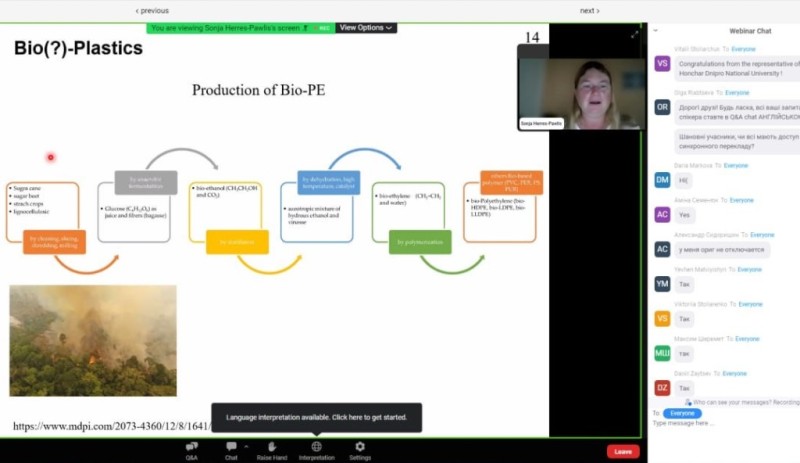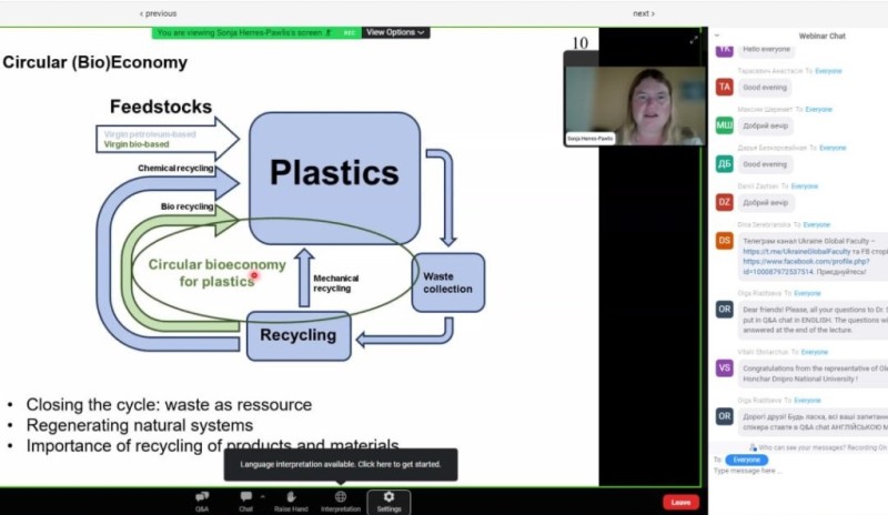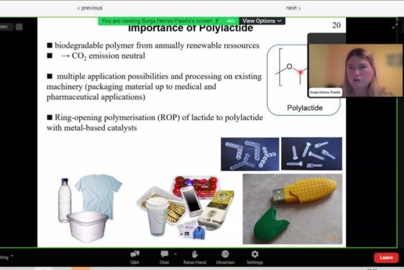 Нещодавно відбулася онлайн-лекція завідувачки кафедри біонеорганічної хімії Інституту неорганічної хімії Рейнсько-Вестфальського технічного університету Аахена (Німеччина) Сонії Херрес-Павліс «Introduction to bioplastics», до якої долучились і магістранти кафедри біотехнології і мікробіології нашого університету.