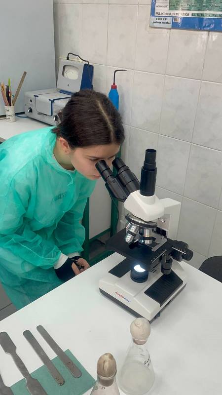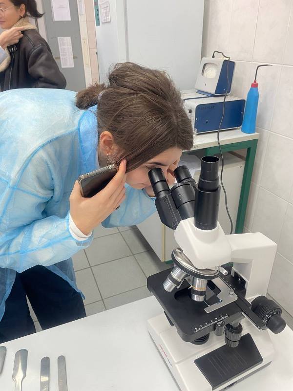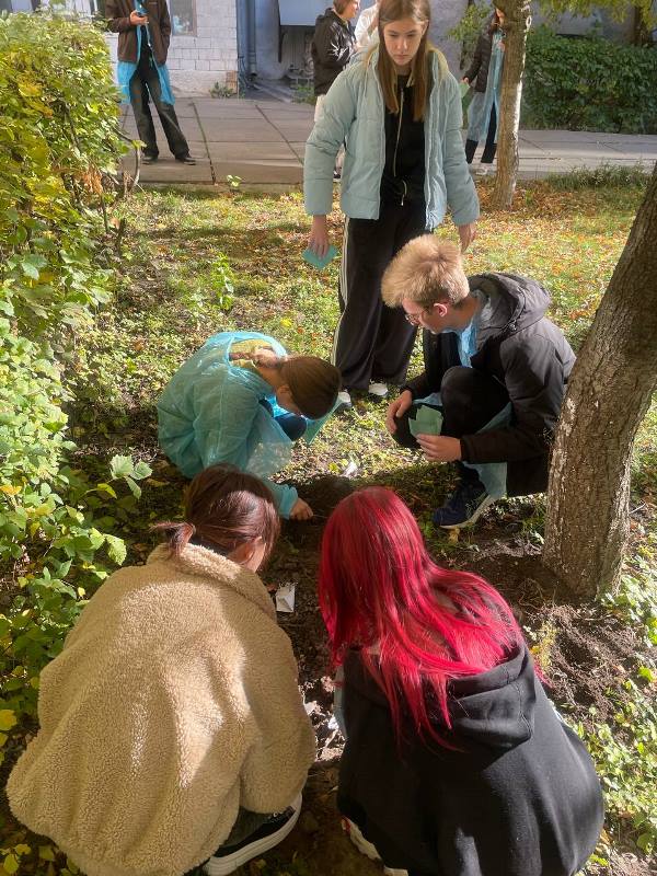 Далі на учасників чекав навчальний квест, який поєднав інтерактивний досвід і елементи наукової роботи. За кілька тижнів до Біотехнологічних студій НУХТ здобувачі старших курсів заздалегідь підготували кілька спеціальних скелець, які закопали у різних частинах внутрішнього дворика НУХТ. І тепер завданням учасників було знайти скельце, використовуючи орієнтири, кмітливість і спритність, що додавало квесту інтриги. Після того, як учасники знайшли скельця, розпочинався другий практичного кейсу – підготовка зразків до дослідження мікробіоти ґрунту. Кожний учасник мав очистити скельце, обробити його за спеціальною методикою, щоб підготувати до подальшого фарбування, а також нанести на нього спеціальний барвник. Цей процес потребував певних навичок, тому здобувачі старших курсів допомагали гостям, пояснюючи кожний крок. Потім учасники мікроскопіювали зразки. Це був момент, коли наука стала «живою», адже наші гості змогли побачити різноманітні форми мікроорганізмів, що населяють ґрунт.