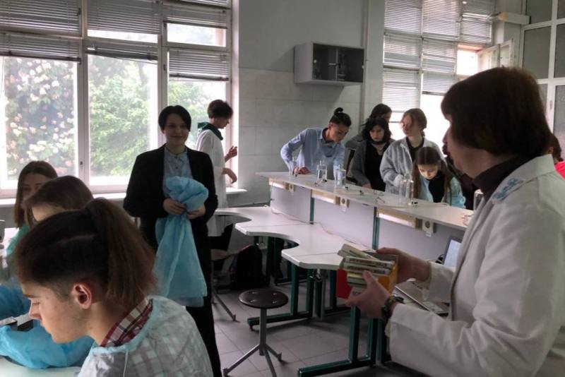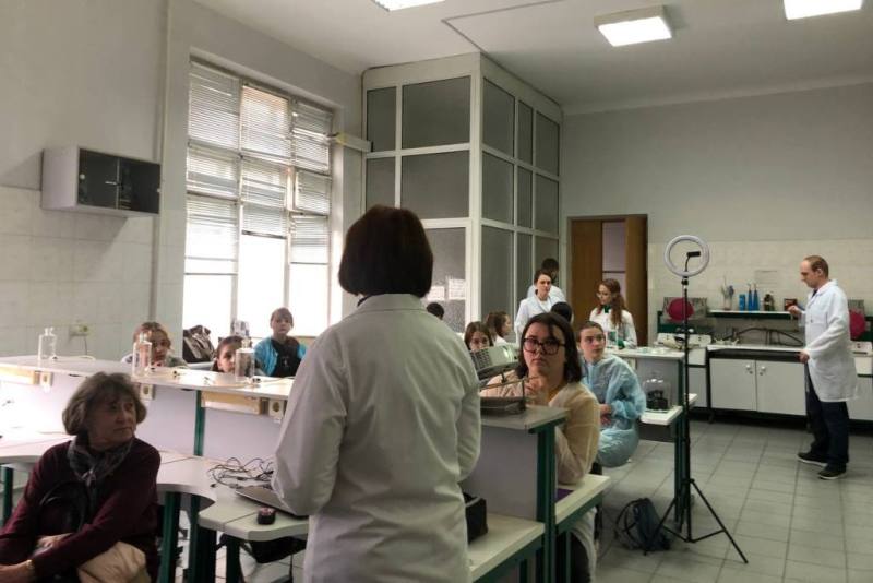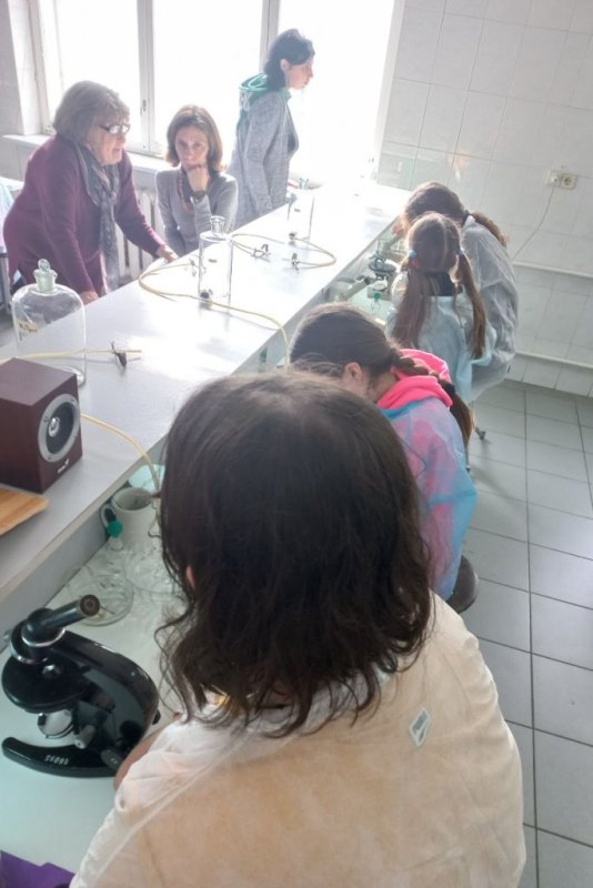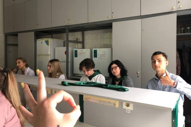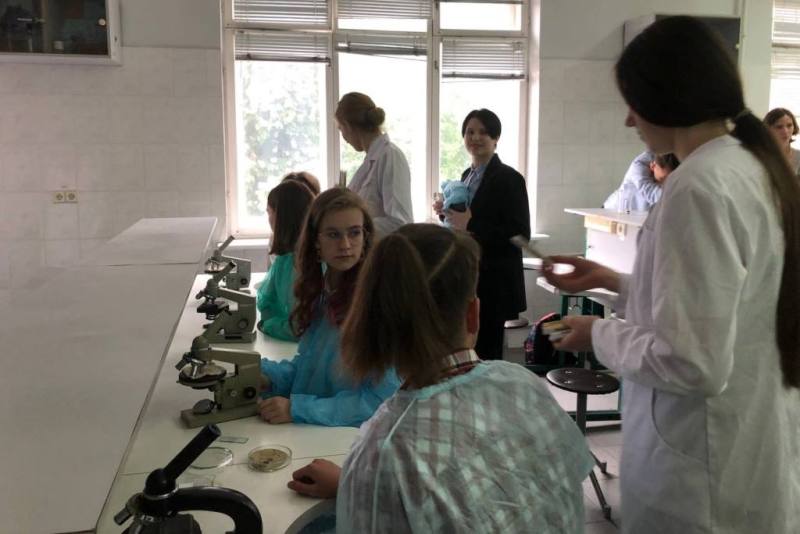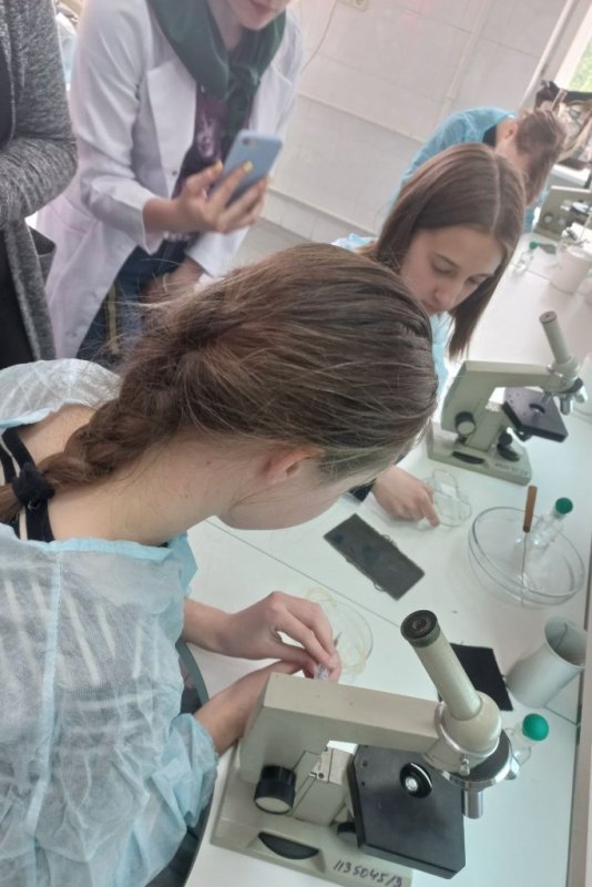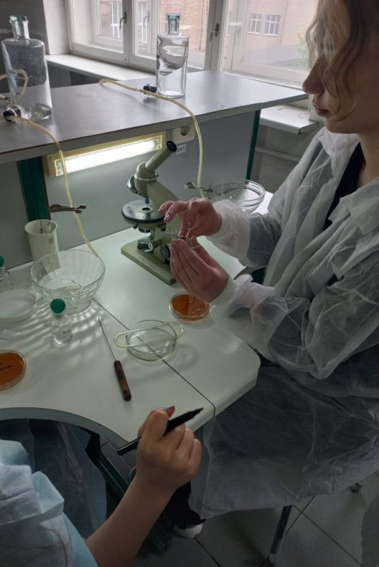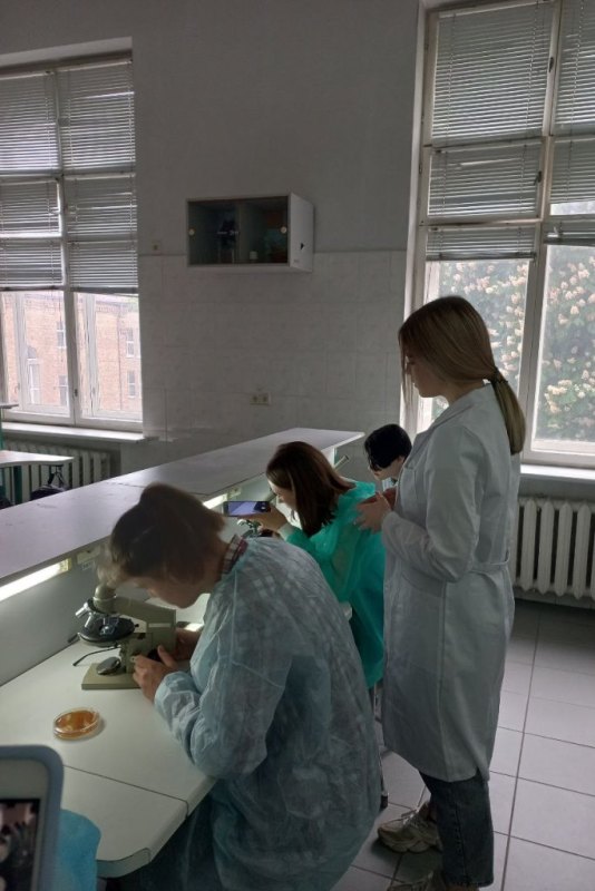 Крім цього, практично опановували правила роботи зі світловим мікроскопом, навчилися робити мікропрепарат для дослідження за методикою «розчавлена крапля», подрібнювати у керамічній ступці необхідний досліджуваний матеріал і згодом використовувати його для якісних реакцій у скляних пробірках. Також, учні мали можливість виростити свою культуру мікроорганізмів у чашці Петрі з поживним середовищем, додаючи до неї біологічні зразки напою «Комбуча» або торкаючись поверхні долонею поживного середовища. Усі учні були вдягнуті у медичні халати під час роботи з біологічним матеріалом.