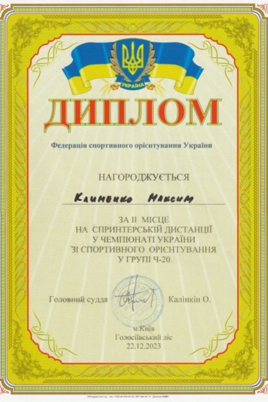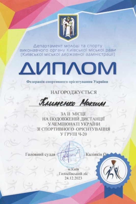 Здобувач другого курсу групи БТ-2-1 факультету біотехнології та екологічного контролю Максим Клименко посів ІІ місце в особистому заліку на спринтерській дистанції (3,9 кілометри), І місце у 2-етапній командній естафеті (3,8 кілометри) та подовженій дистанції (8,6 кілометри) по групі Ч20.