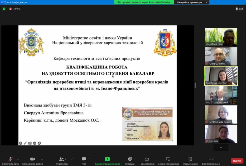 14 лютого екзаменаційна комісія працювала і на кафедрі технології м'яса і м'ясних продуктів, розглядаючи кваліфікаційні роботи за спеціальністю 181 «Харчові технології», освітньо-професійною програмою «Харчові технології та інженерія». Її очолив завідувач кафедри, професор Василь Пасічний. До складу ЕК увійшли доценти Ігор Страшинський, Олександра Гащук та Олег Галенко (секретар ЕК).