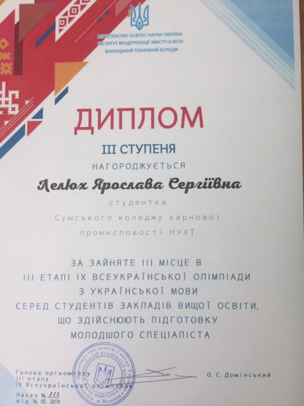 Сумську область представляла студентка Сумського коледжу харчової промисловості нашого університету Ярослава Лелюх, яка є переможцем ІІ етапу олімпіади.