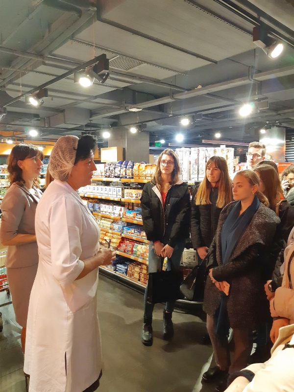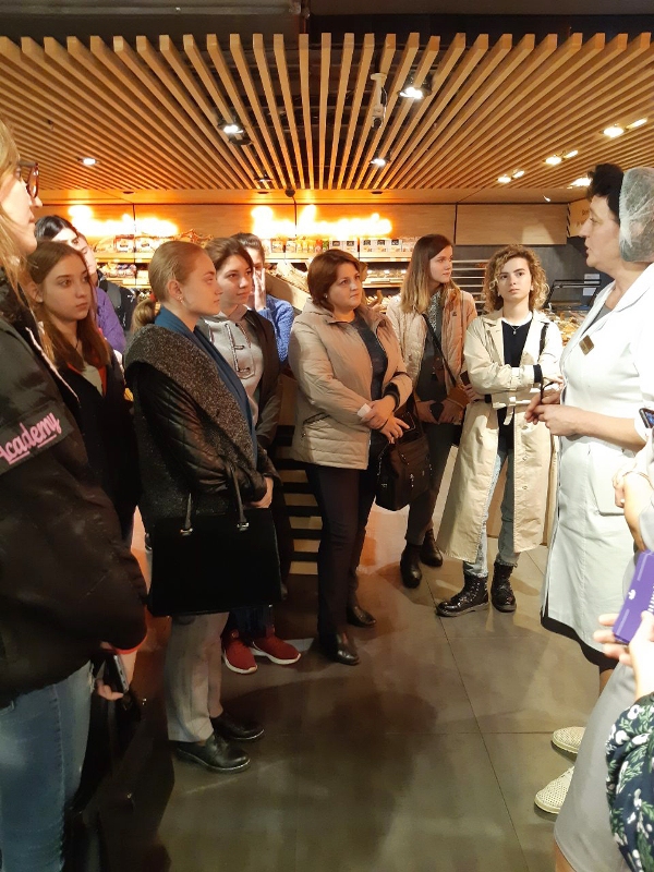 Студенти груп ТІ-2-3 і ТІ-1-6 разом із доцентами кафедри технології хлібопекарських і кондитерських виробів Юлією Бондаренко та Ларисою Михонік відвідали один із магазинів мережі «Сільпо». Студентів дуже привітно зустріли керуюча магазином Галина Дрейт і головний технолог пекарні. Студенти дізналися про історію розвитку компанії та виробників, із якими співпрацює мережа магазинів, умови праці та працевлаштування. Найбільше уваги керуюча приділила власному виробництву, зокрема пекарні. Вона розповіла про асортимент виробів, які випускає пекарня, відзначивши, що лише 50% асортименту пекарні є постійним, а 50% змінюється, реагуючи на вподобання споживачів, сезонність, пору року та свята. Зараз у пекарні широко представлені вироби з сезонними плодами - яблуками, грушами, гарбузом. Компанія також пишається тим, що якість їх європейських хлібобулочних виробів - багетів, круасанів, бретцелів, чіабати не раз відзначали іноземці. Студентів пригостили дуже смачною випічкою з грушею. Керуюча магазином розповіла цікаву історію розроблення рецептури граноли, попит на яку займає одну з перших сходинок всього асортименту. Технолог відзначила, що пекарня виготовляє широкий асортимент дієтичного хліба, бездріжджовий хліб, солодкі вироби для веганів.