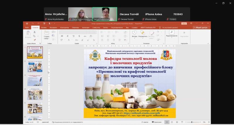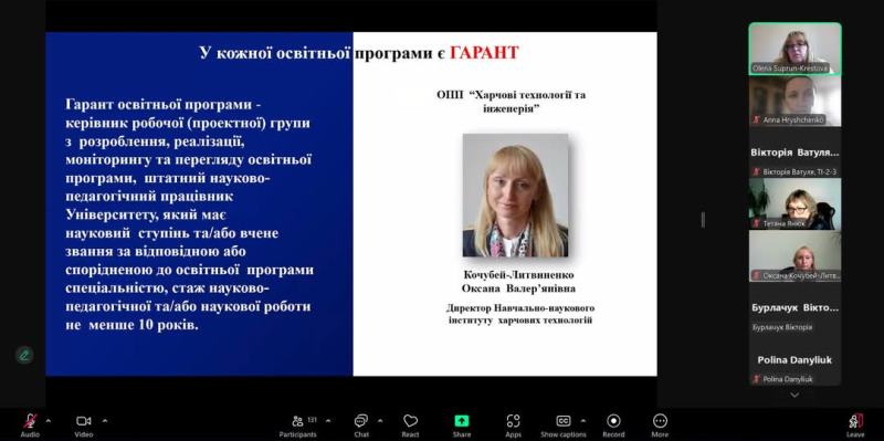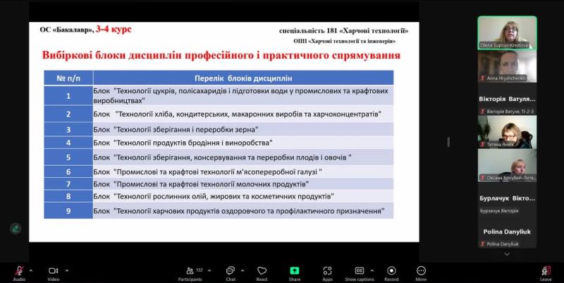 У Навчально-науковому інституті харчових технологій зустріч із другокурсниками-бакалаврами денної і заочної форм навчання з метою ознайомлення їх з правилами вибору блоку дисциплін професійного і практичного спрямування спеціальності 181 «Харчові технології», які вони вивчатимуть на третьому та четвертому курсах, відбулася 20 травня. На зборах була присутня директорка інституту Оксана Кочубей-Литвиненко, заступниці директорки, завідувачі та викладачі випускових кафедр.