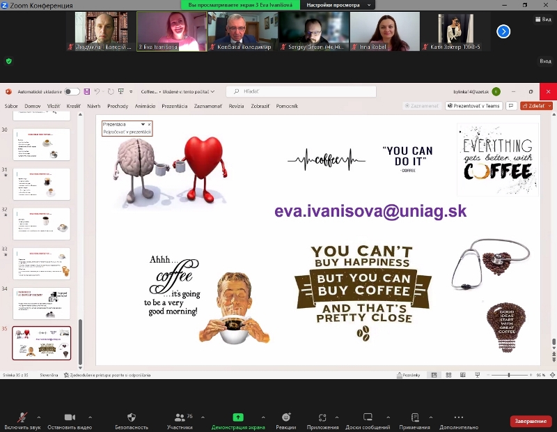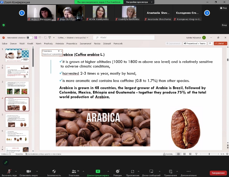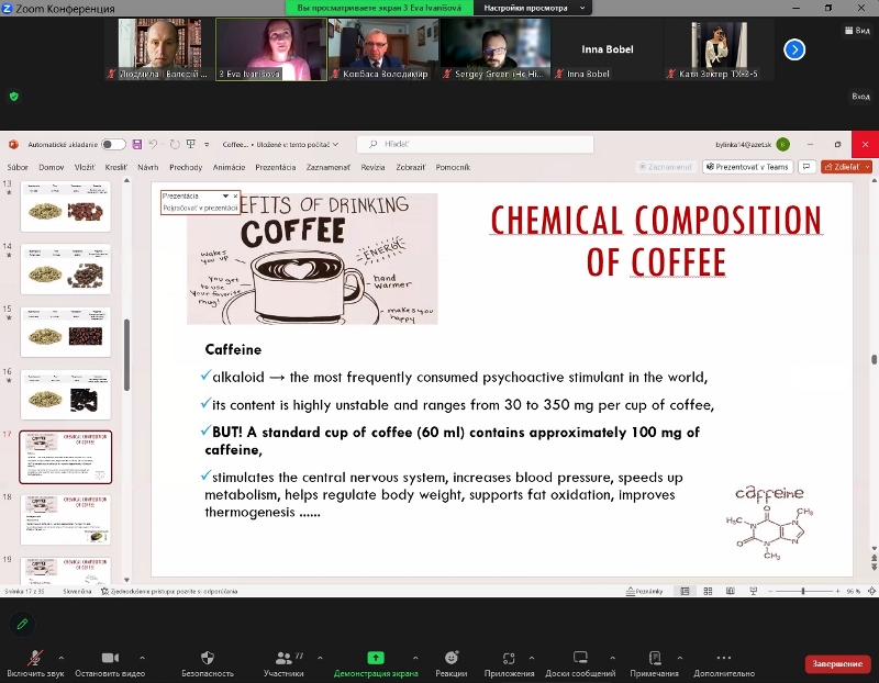 У лекції на тему «Coffee: benefits, nutrition and risks» фахівчиня висвітлила актуальні питання щодо хімічного складу зеленої кави, способів підготовки її до виробництва, особливостей технології обсмаження та змін, які відбуваються в процесі її виробництва. Зважаючи на те, що у світі багато людей вживають кавові напої, лекторка звернула увагу не лише на харчову цінність кави та користь, а й на ризики надмірного її вживання.
