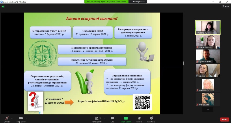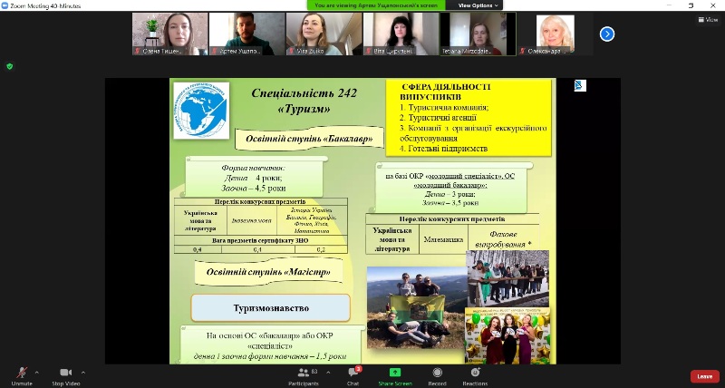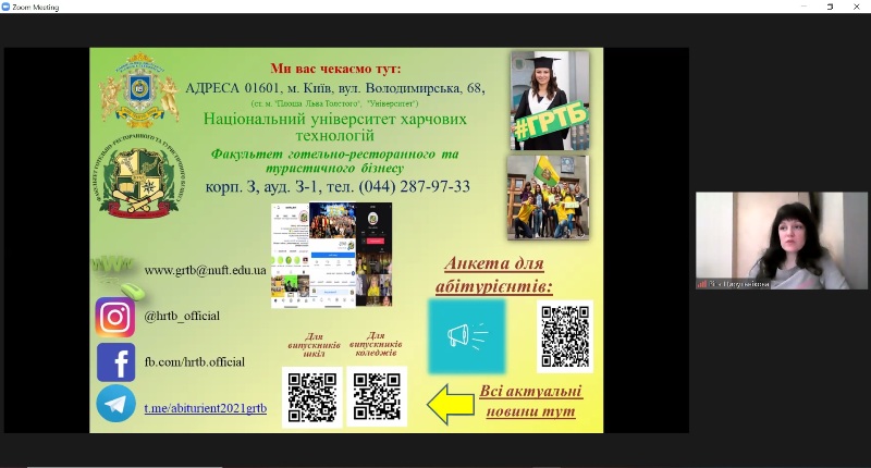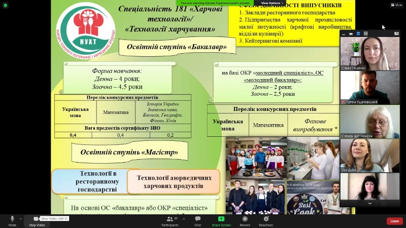Гостей профорієнтаційного онлайн-заходу об’єднало бажанням здобути освіту у сфері гостинності за спеціальностями 241 «Готельно-ресторанна справа», 242 «Туризм» і 181 «Харчові технології» (освітня програма «Технології харчування»).