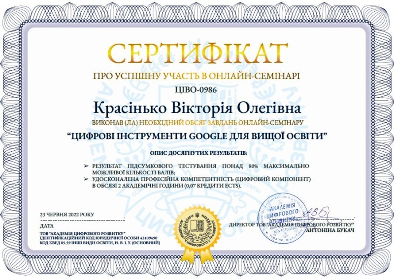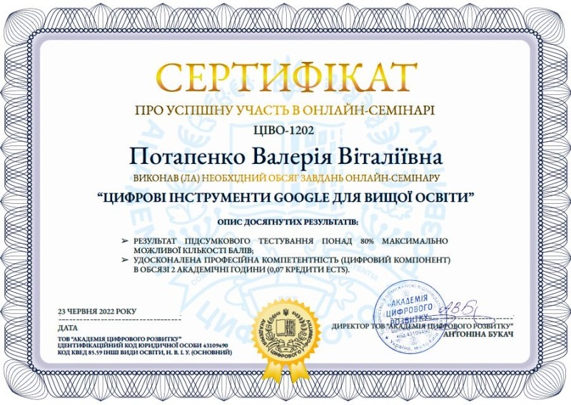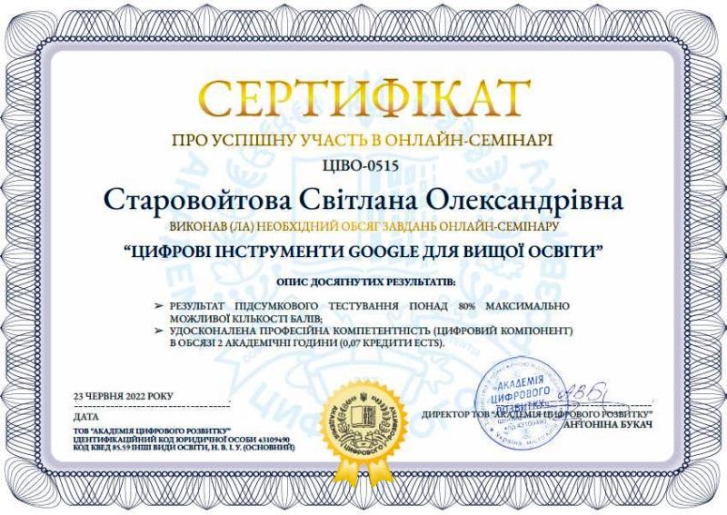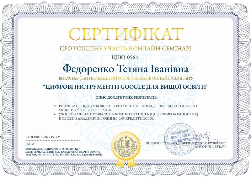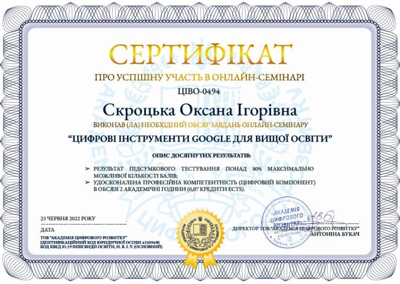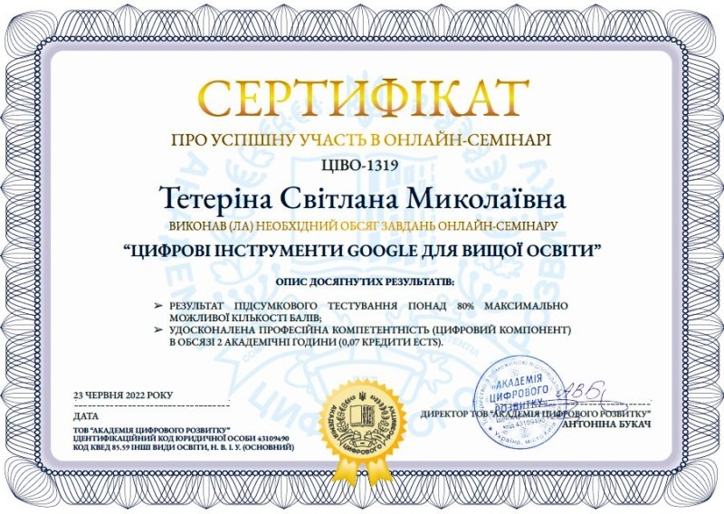 Опанувавши теми навчальних занять, наші викладачі розвинули та вдосконалили інформаційно-цифрові компетентності, сформували навички створення інноваційних продуктів в освітній діяльності, зокрема, для організації дистанційного навчання.