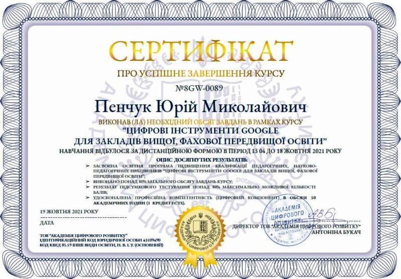 Згідно з програмою навчання викладачами були опановані теми: знайомство з цифровими інструментами для взаємодії під час освітнього процесу Google Workspace for Education, основи Google Workspace for Education; огляд основних освітніх інструментів і функцій; переваги в здійсненні управління закладом освіти; практичні рекомендації щодо ефективного використання Google Академія; демонстрація можливостей розширеного пошуку Google та Google Сповіщень; робота з даними: як використовувати Google Public Data, Dataset Search, Google Data Studio та Google Cloud Platform для наукової діяльності; оновлення і доповнення цифрових інструментів Google Workspace for Education для оптимізації освітнього процесу онлайн.