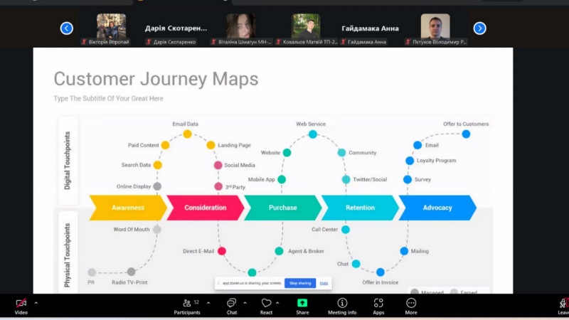 До уваги здобувачів освіти були представлені правила побудови карти клієнтської подорожі, принципи роботи з GoogleAnalytics, системами CRM, засади успішності в SMM, інноваційні підходи до створення контенту з урахуванням оптимізації пошукових систем та алгоритмів роботи соціальних мереж.