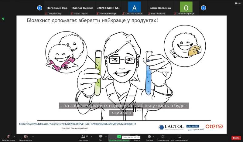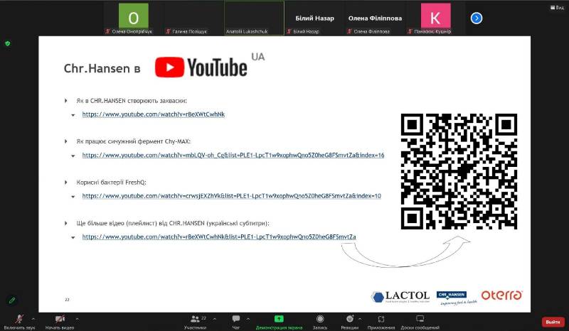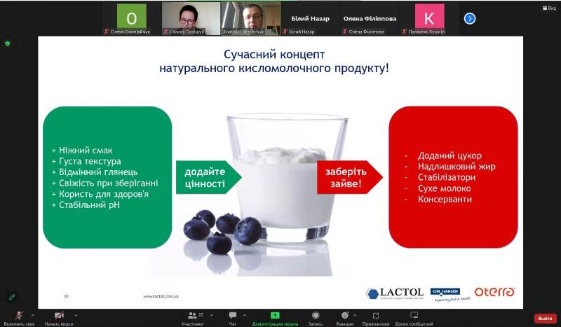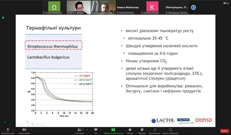 Особливу увагу фахівець приділив способам виробництва, видовому складу, умовам зберігання і застосування культур прямого внесення (DVS) у технологіях ферментованих молочних продуктів. Також було розглянуто критерії вибору мезофільних, термофільних, мезо-термофільних і спеціальних (додаткових) культур для виробництва широкого асортименту молочних продуктів, способи біологічного захисту і концепт удосконалення складу натуральних кисломолочних продуктів, сучасний асортимент бактеріальних культур на прикладі інноваційних серій YO-Flex® та eXact®.