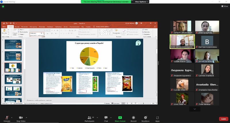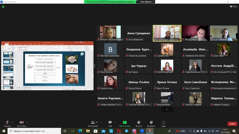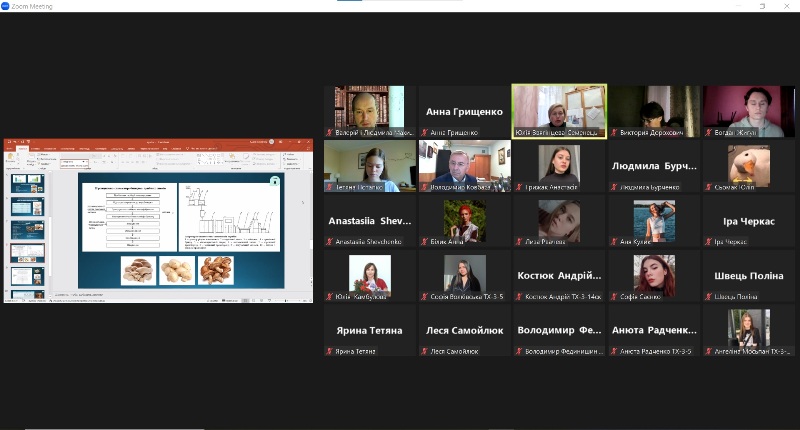 Тема лекції – «Технологія харчоконцентратів на основі їстівних грибів». Зважаючи на швидкий темп життя сучасної людини, в усьому світі зростає попит на солодкі та солоні снеки, які повністю готові до споживання та дають можливість швидко втамувати голод. Зростання попиту на таку продукцію спонукає до розроблення нових видів снеків, зокрема на основі штучно культивованих грибів. Під час лекції Юлія Звягінцева-Семенець навела інформацію про гливи, печериці та шиїтаке, які культивують в Україні та які використовують для виробництва снеків. Здобувачі дізналися про особливості хімічного складу цих видів грибів та їх значення у харчуванні людини. Детально були розглянуті технології грибних снеків і закусок. Цікавою для студентів була інформація про наукові дослідження та розробки технології грибних снеків викладачів кафедри.