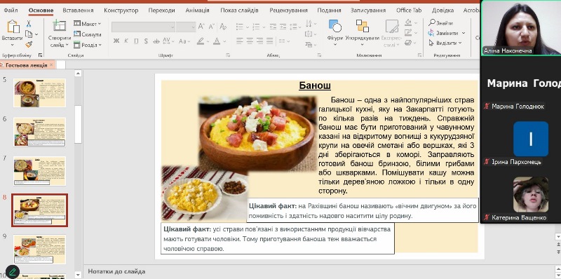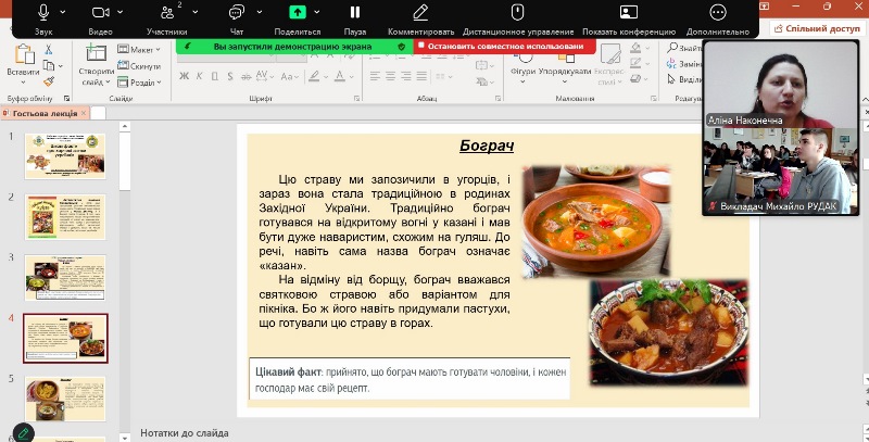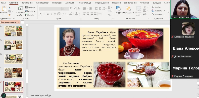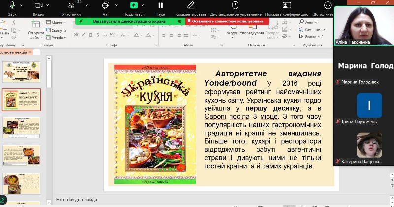 Українська кухня входить до десятки кращих кухонь світу й трійки найпопулярніших кухонь Європи. У європейських ресторанах опановують приготування борщу, голубців, вареників, бограчу та узвару. Лекторка ознайомила слухачів із українськими традиційними стравами, навела приклади складання традиційного меню, сервірування та подання їх до столу.