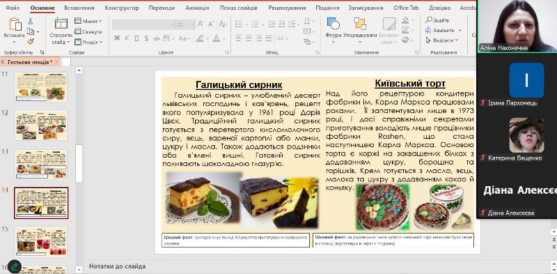 Протягом березня доцентка кафедри технології ресторанної і аюрведичної продукції Аліна Наконечна прочитала ряд гостьових лекцій на тему «Цікаві факти про харчові звички українців» для здобувачів спеціальності 181 «Виробництво харчової продукції» Івано-Франківського фахового коледжу ресторанного сервісу і туризму НУХТ і Київського фахового коледжу ресторанного господарства НУХТ.