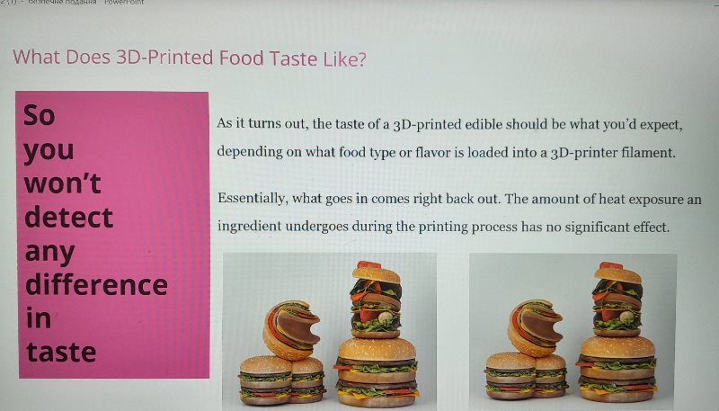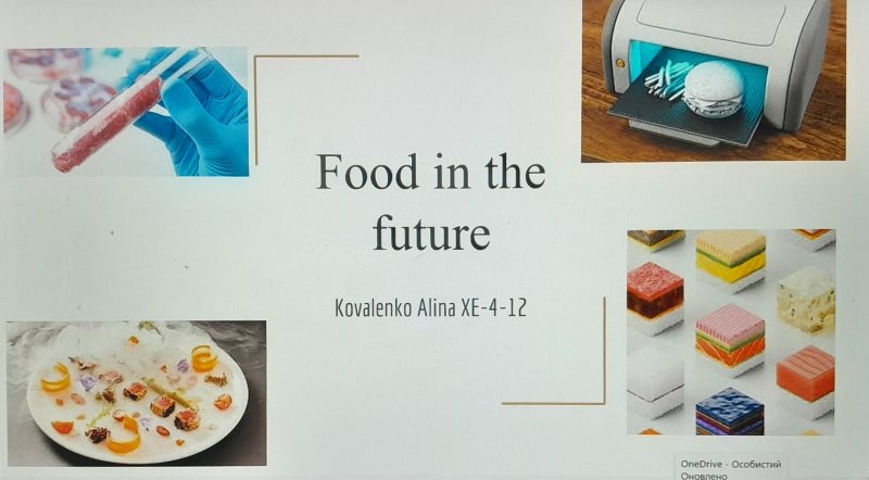 Цікавим досвідом свого навчання можуть поділитися здобувачі освіти 4 курсу Навчально-наукового інституту харчових технологій, групи ХЕ-4- 12 ( викладачка – Любов Сапон-Аблязова). На студентському форумі, де вони представляли свої презентації за професійною тематикою, новизною, актуальністю і складністю теми увагу привернула доповідь Аліни Коваленко «Їжа майбутнього» («Food in the future»).