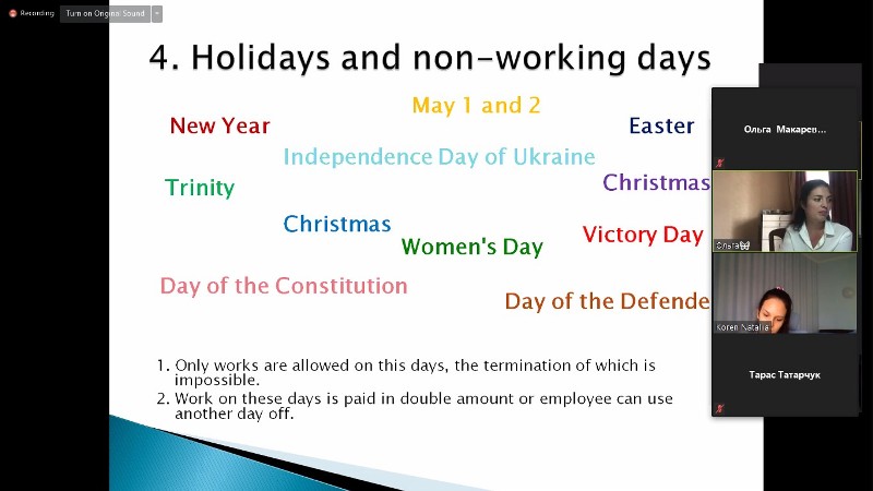 Усім відомо, що для ефективної роботи потрібне і хороше відновлення сил. От і студенти разом із лекторкою розпочали вивчення теми, що стосується саме відпочинку: відпусток різного характеру, державних свят і вихідних днів.