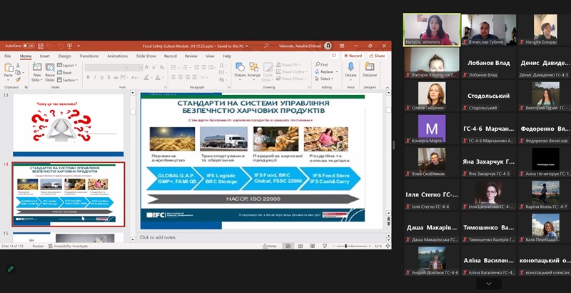 Пані Наталія прочитала цикл лекцій у межах вивчення навчальної дисципліни «Менеджмент якості та культура харчової безпеки в закладах сфери гостинності» в осінньому семестрі 2023-2024 навчального року, під час яких детально ознайомила здобувачів освіти з міжнародними стандартами систем менеджменту якості та харчової безпеки, розглянула питання біопильності, біотероризму, харчового шахрайства, важливості усвідомлення значення культури харчової безпеки та втілення її в життя різними операторами ринку харчових продуктів, зокрема підприємствами ресторанного господарства.
