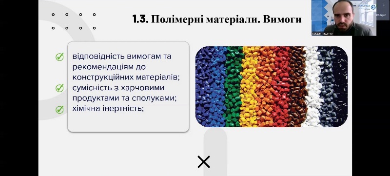 Викладач і четвертокурсники обговорювали сучасні конструкційні матеріали, що використовуються у виробництві технологічного обладнання для харчової промисловості. Розглянули вимоги до матеріалів та їх типи, а також сучасну міжнародну і вітчизняну нормативну документацію. Лектор навів приклади застосування матеріалів та акцентував увагу здобувачів освіти на впливі застосування матеріалів на якість і безпечність харчових продуктів, що особливо важливо для технологів харчової експертизи. Для кращого засвоєння студентами матеріалів лекції викладач продемонстрував практичні кейси та додаткові відеоматеріали.