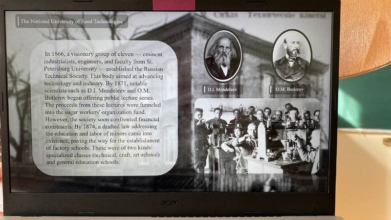 Згадували, а хтось і знайомився, видатних особистостей, причетних до створення у 1884 році в місті Сміла першого навчального закладу для підготовки техніків-хіміків і майстрів цукрового виробництва, – цукрозаводчика, засновника цукрової промисловості в Україні, графа Олексія Бобринського, завдяки зусиллям родини якого Київ став «цукровою столицею» світу. А ще була інформація про провідних учених всесвітнього рівня, професорів Дмитра Менделєєва, Олександра Бутлерова, Миколу Бунге, які підтримали створення навчального закладу як своїм авторитетом, так і фінансово.