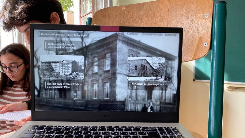 На кафедрі іноземних мов професійного спрямування відбулося чергове засідання Speaking Club, на якому студенти груп ТІ-1-1, ТІ-1-4 першого курсу Навчально-наукового інституту харчових технологій під керівництвом старшої викладачки кафедри Людмили Юрчук презентували різноманітні автентичні матеріали з історії університету.