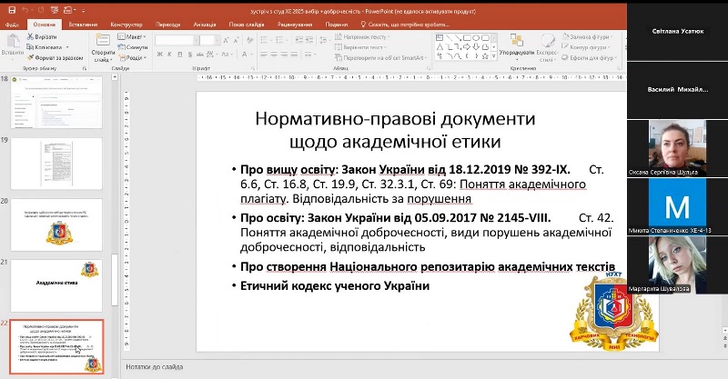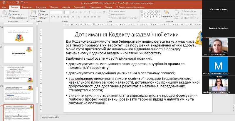 Особливу увагу під час зустрічі було приділено питанню академічної доброчесності. Магістрантів ознайомили з основними нормативними документами, зокрема з Кодексом академічної етики університету. У підсумку – всі учасники підписали Декларацію про дотримання академічної доброчесності.