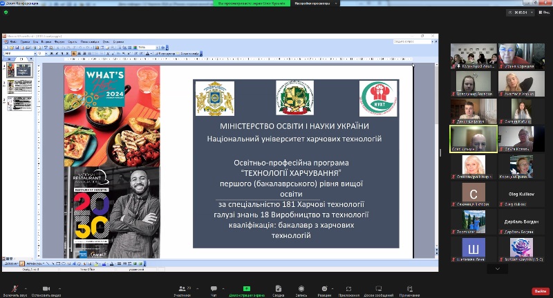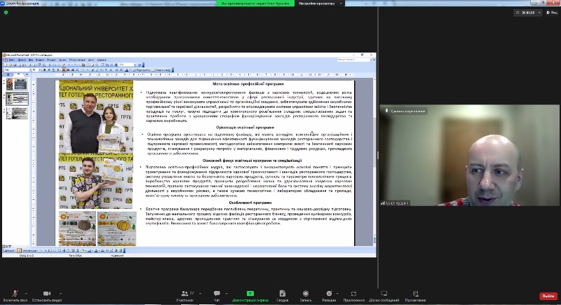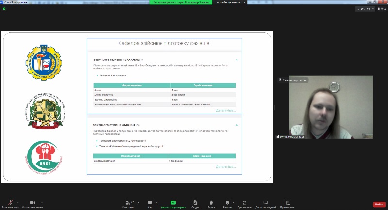 Зустрічала гостей завідувачка кафедри, професорка Олександра Нєміріч. Викладачі кафедри, професор Олег Кузьмін, доценти Ірина Корецька та Володимир Захаров розповіли слухачам зі Львівського фахового коледжу харчових технологій та бізнесу НУХТ, Волинського фахового коледжу НУХТ, Полтавського фахового коледжу НУХТ та Державного професійно-технічного навчального закладу «Хмільницький аграрний центр професійно-технічної освіти» про наш університет. Вони ознайомили викладачів і здобувачів зі структурою НУХТ, факультетом готельно-ресторанного та туристичного бізнесу імені проф. В.Ф. Доценка, кафедрою технології ресторанної і аюрведичної продукції.