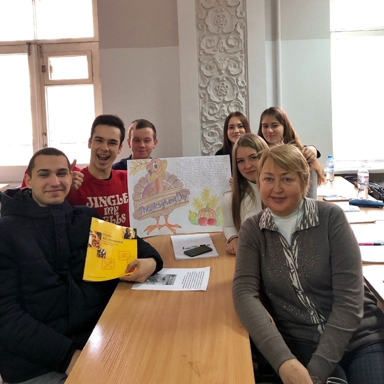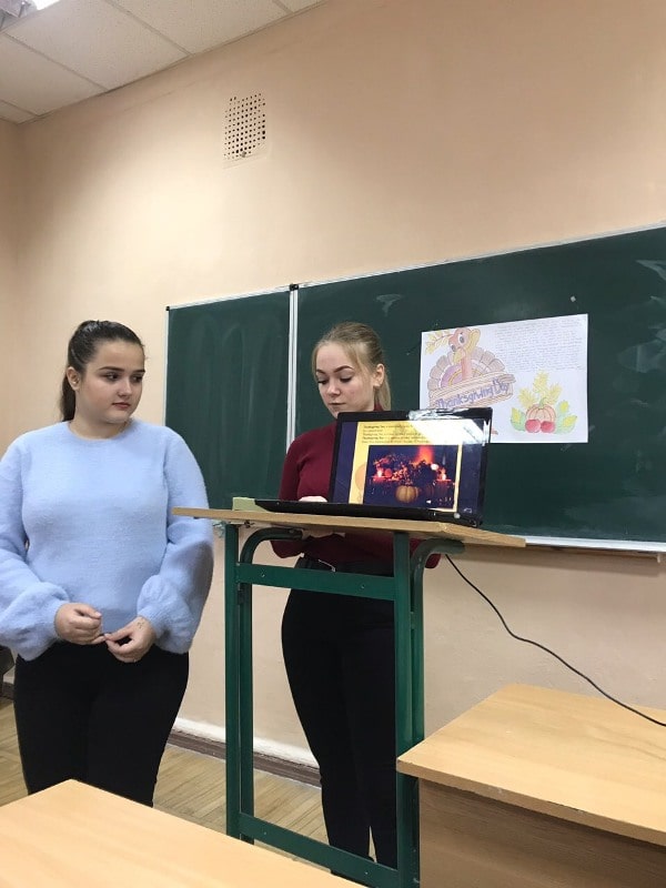 Тому в межах вивчення традицій і звичаїв Сполучених Штатів та інших англомовних країн старші викладачі кафедри іноземних мов професійного спрямування Лариса Яненко і Людмила Юрчук організували й провели захід до цього національного свята – «Thanksgiving Day» з групами студентів факультету готельно-ресторанного та туристичного бізнесу ГС 1-4, ГС 1-5, ТУ 2-11.