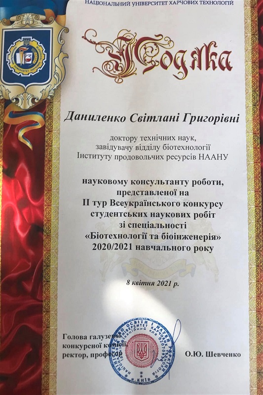 Із вдячністю за продуктивне і тривале співробітництво деканці факультету біотехнології та екологічного контролю Наталії Грегірчак приємно було вручити Подяку ректора НУХТ завідувачці відділу біотехнології, д.т.н. Світлані Даниленко за наукове консультування студентів-біотехнологів.