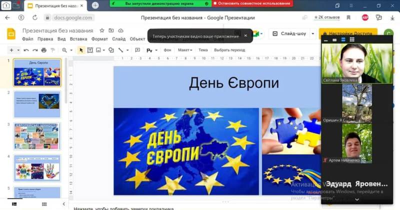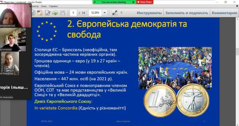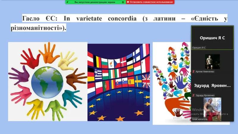 Цьогоріч День Європи у Смілянському технологічному фаховому коледжі нашого університету відбувся віртуально. На годинах спілкування класні керівники груп ОКС19, ОРГ19, ВХК19, МД20, АКТ20а, ОКС18, ВХК18 обговорили зі студентами шлях інтеграції України до ЄС, який розпочався ще у 2014 р., подискутували, чому важливо бути вільним, хто має захищати свободу людини, роль ЄС у вирішенні проблем України.