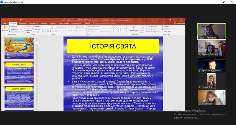 Професорка Надія Левицька знайомила здобувачів із історією вшанування цього свята та його значенням для сьогодення, українським козацтвом, яке було справжнім оборонцем рідної землі, віри, традицій у всі часи. Історикиня наголошувала, що відзначення Дня захисників і захисниць України саме на Свято Покрови посилює піднесення національної гідності українського народу. Викладачі кафедри проводили тематичні бесіди.