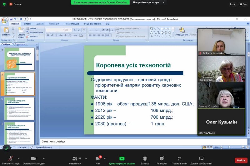 З доповідями англійською мовою виступили доцентка кафедри технології оздоровчих продуктів Світлана Камінська та професорка кафедри іноземних мов професійного спрямування Наталія Науменко.