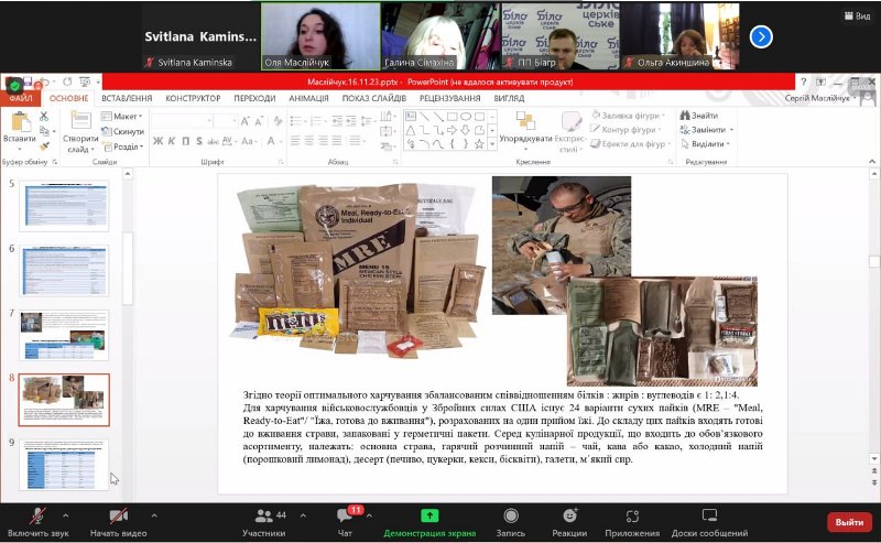 Велику увагу на конференції приділено і створенню спеціальних харчових продуктів та харчових раціонів для військовослужбовців ЗСУ, Нацгвардії, територіальної оборони. Мається на увазі доповідь доцентки Львівського національного університету імені Івана Франка Ольги Маслійчук, у якій авторка детально окреслила теоретичні і практичні аспекти обґрунтування складу і розроблення харчування для військовиків. Ця тема багатопланова, різноманітна і має стати пріоритетом як для науковців, так і практиків харчової промисловості.