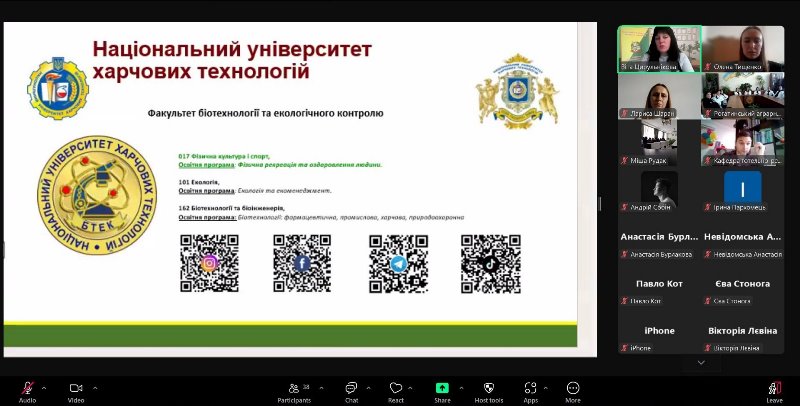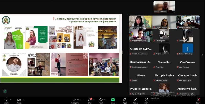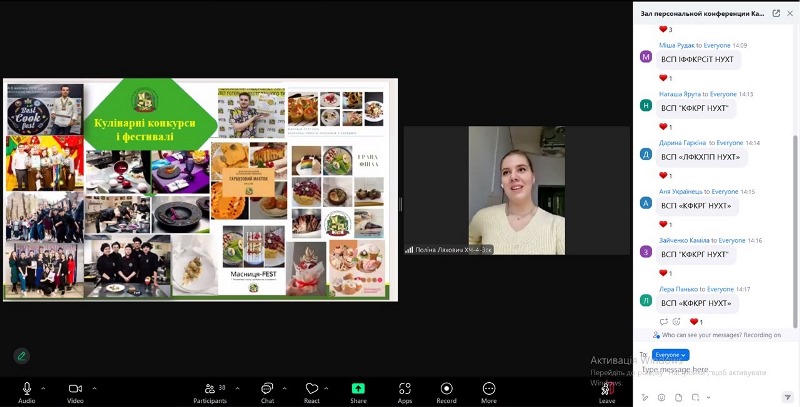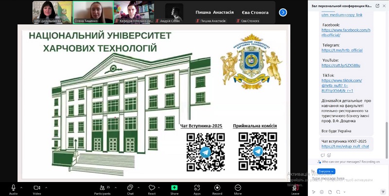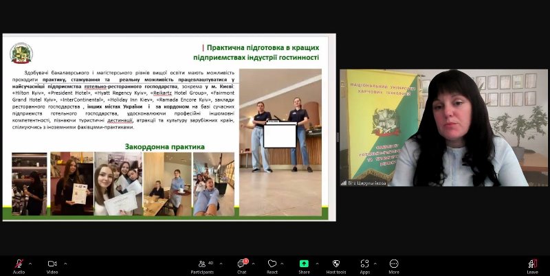 Аудиторія в онлайні – здобувачі освіти Львівського фахового коледжу харчової та переробної промисловості НУХТ, Івано-Франківського фахового коледжу ресторанного сервісу і туризму НУХТ, Волинського фахового коледжу НУХТ, Київського фахового коледжу ресторанного господарства НУХТ, Рогатинського аграрного фахового коледжу, які завітали на запрошення завідувачки кафедри готельно-ресторанної справи Лариси Шаран і доцентки кафедри Ольги Дульки.