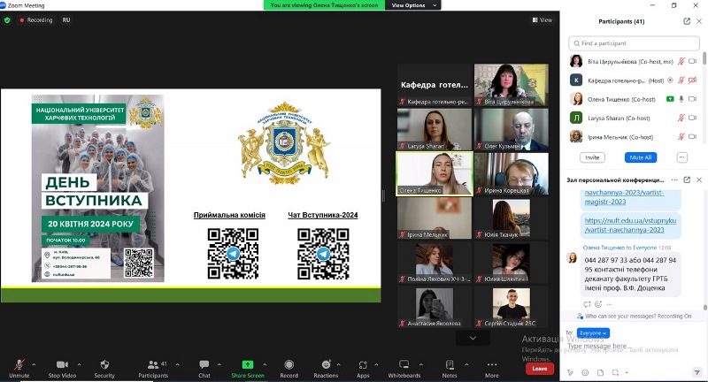 Відкрила профорієнтаційний івент в освітньому діджитал-просторі деканка факультету Віта Цирульнікова, яка презентувала учасникам переваги здобуття вищої освіти у НУХТ, зокрема сучасні особистісно-орієнтовані технології навчання, матеріально-технічна база підготовки фахівців, інноваційний комплекс навчальних лабораторій, практична підготовка у кращих підприємствах HoReCa в Україні та за кордоном, активне залучення стейкголдерів до освітнього процесу, формування іншомовної компетентності майбутніх професіоналів сфери гостинності та англомовне навчання. Модерувала захід заступниця декана по роботі зі студентами і відповідальна за профорієнтаційну роботу факультету Олена Тищенко.