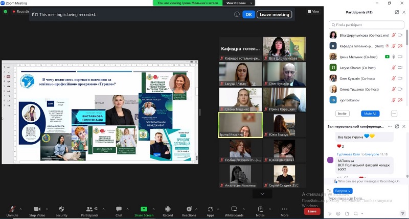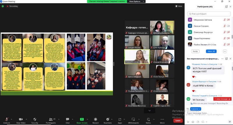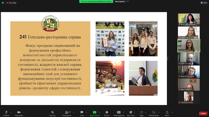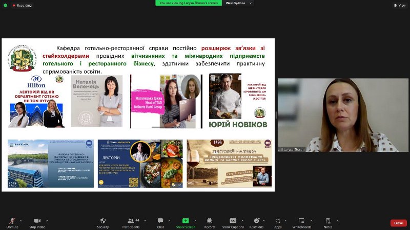 Заступниця декана по роботі зі студентами Олена Тищенко запросила гостей у віртуальний тур яскравим студентським життям, сповненим наукових, культурно-мистецьких, кулінарно-мистецьких, спортивних, благодійних івентів, гостьових лекторіїв, воркошопів, кар’єрних консультацій, нетворкінг-зустрічей із успішними власниками закладів гостинності, управлінцями, фахівцями-практиками. І поділилася успішними кейсами випускників, адже це найкраще підтвердження конкурентоспроможності та затребуваності фахівців у вітчизняному та міжнародному готельно-ресторанному і туристичному бізнесі.