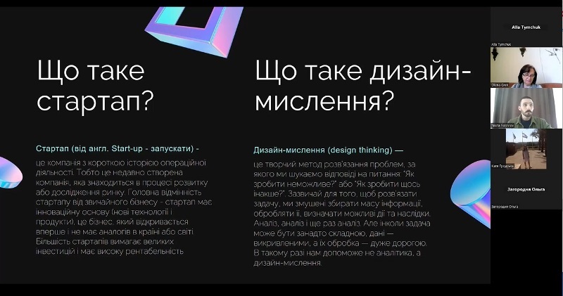 Лектор представив інструменти, за допомогою яких можна почати мислити інноваційно – розкрити приховані можливості, що базуються на отриманих знаннях. Навів приклади, як працювати з моделлю чотирьох запитань, які допомагають краще зрозуміти дизайн-мислення як підхід до вирішення складних проблем і створення інновацій. Також Нікіта Соловйов продемонстрував дизайн-мислення в дії із застосуванням відповідних методів, вказав способи мислення, а також швидкі та прості шляхи перевірки дієвості інноваційних рішень.