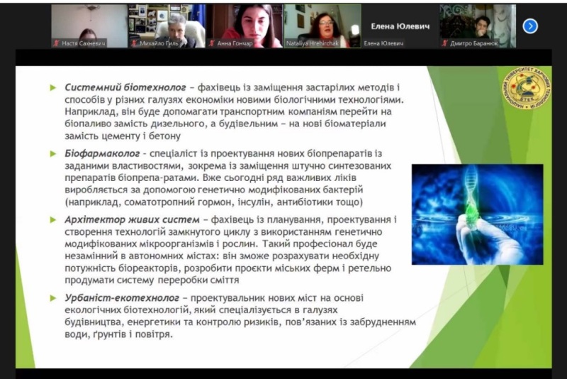 Здобувачі дізналися, що біотехнологія спрямована на дослідження можливості використання живих організмів або продуктів їхньої життєдіяльності з метою пошуку варіантів розв’язання сучасних проблем у медицині, сільському господарстві та інших сучасних галузях біотехнології. Один із напрямків біотехнології — генна інженерія, яка займається вивченням біологічних процесів у живих організмах для створення нових видів тварин, рослин, мікроорганізмів чи покращення властивостей тих, що вже існують, що передбачає опанування здобувачами відповідних освітніх компонент. Сучасні методи біотехнології дають змогу забезпечувати безліч людських потреб – від модифікації рослин для підвищення якості харчових продуктів до розроблення життєво необхідних медичних препаратів, що потребує від здобувачів опанування дисциплін не тільки природничого спрямування, але і знання і розуміння біоінженерних процесів.