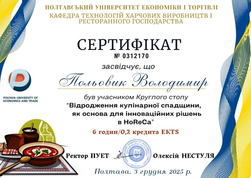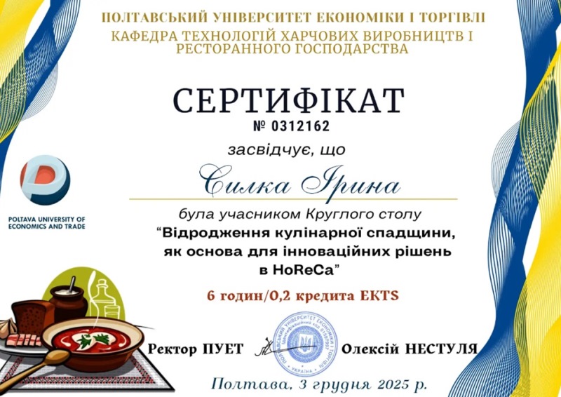 3 грудня 2025 року викладачі кафедр готельно-ресторанної справи та технології ресторанної і аюрведичної продукції Віта Цирульнікова, Лариса Шаран, Наталія Бондар, Оксана Кирпіченкова, Ірина Корецька, Людмила Мамченко, Володимир Польовик, Ірина Силка, Наталія Стукальська взяли участь у науковому семінарі у форматі Круглого столу на тему «Відродження кулінарної спадщини, як основа для інноваційних рішень у HoReCa», який провела кафедра технології харчових виробництв і ресторанного господарства Полтавського університету економіки і торгівлі.