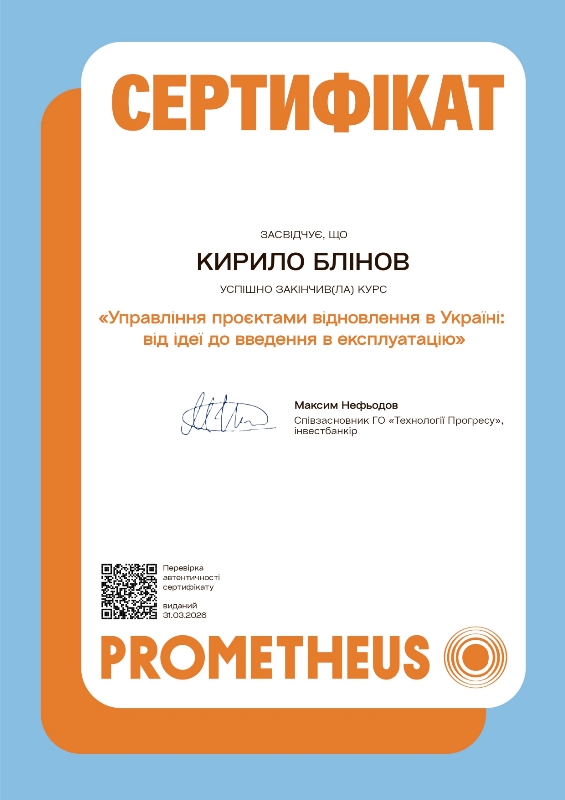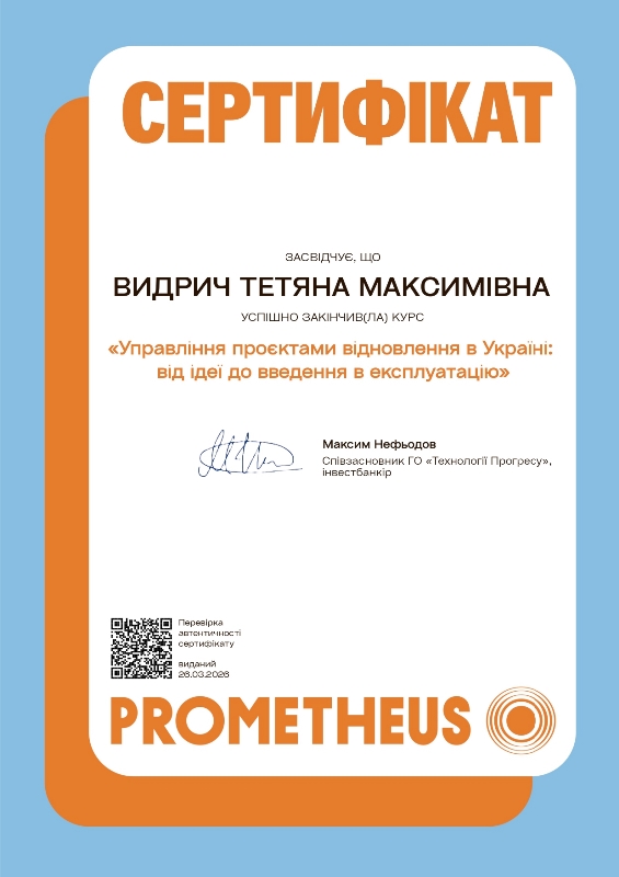 Магістранти освітньо-професійної програми «Менеджмент персоналу» першого курсу Кирило Блінов, Тетяна Видрич і Вікторія Овадюк долучилися до навчання на онлайн-платформі Prometheus. У межах дисципліни «Проєктний менеджмент та дизайн мислення», яку викладає доцентка Ірина Тюха, вони успішно завершили професійний курс «Управління проєктами відновлення в Україні: від ідеї до введення в експлуатацію» та отримали іменні сертифікати.